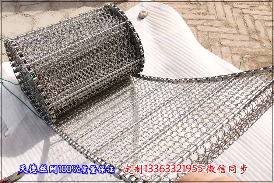 今天河北天德絲網制品有限公司不銹鋼網帶就給大家介紹: 面食在生產線中一般進行烘干比較多,因此在烘干面食的時候我們要采用透氣性好的輸送網鏈,一般透氣性好的輸送網鏈有鏈條輸送帶、鏈板輸送帶、乙型輸送帶、雙旋輸送帶、螺旋型輸送帶等這幾種形式,其中雙旋輸送帶和螺旋型輸送帶也叫做鏈條輸送帶,不同的是在根據使用的情況可以不加裝兩側的鏈條,直接用滾筒帶動傳送。 鏈條式不銹鋼網帶采用鋼絲編織、鋼桿和鏈條的鏈接組裝而成,根據要烘干的面食的大小定制孔徑的大小,孔越大烘干速度越快,當然也的保證每米輸送帶上面的載重量,孔越密承載能力越高。鏈板式不銹鋼輸送帶采用不銹鋼板材沖壓成型,使用在烘干行業中,要在鏈板的表面進行打孔,打孔直徑會根據面食的大小決定,孔越大烘干速度越快,當然孔越大承載能力越差。
