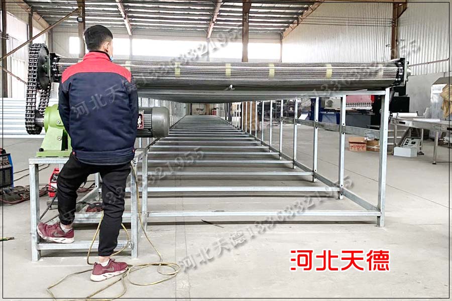 2.網帶輸送機的安裝:在安裝輸送網帶時要注意測量鏈條與軌道的接觸尺寸,確保輸送網帶與軌道重分接觸,不得出現 扭曲或便宜,測量好準確長度后在環形對接。